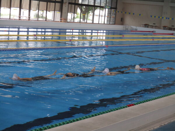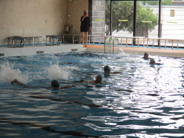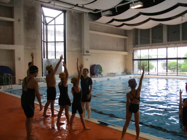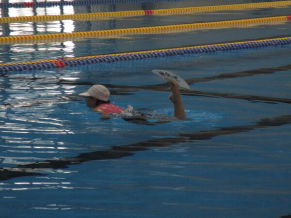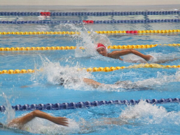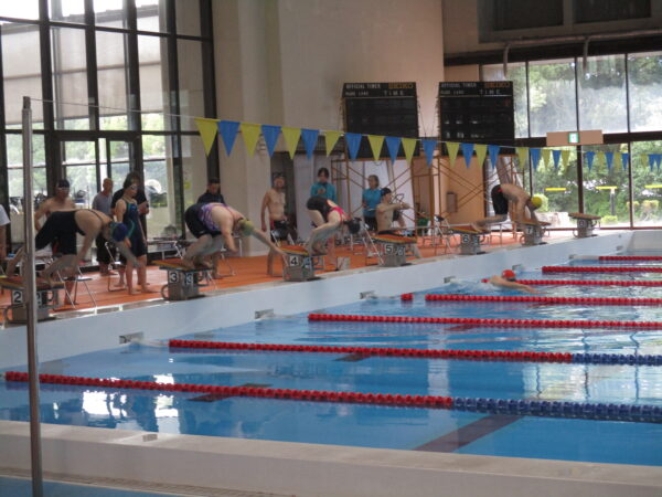 混合リレーで、水球の立ち泳ぎ・神伝流の横泳ぎなど、競泳以外の色々な泳ぎのチームも一緒に競い合い盛り上がりました。
