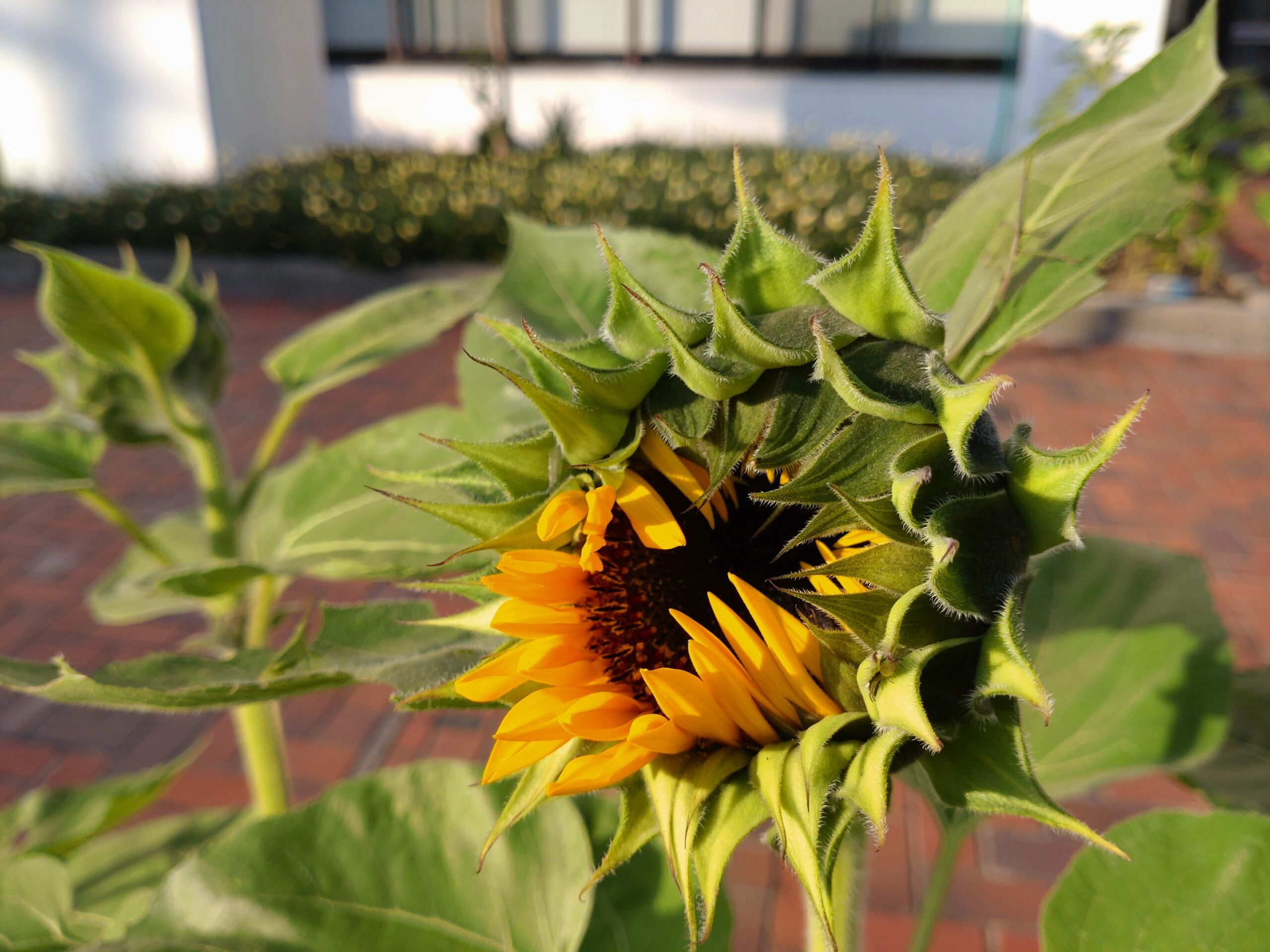 夏の終わりに種を蒔いた「遅咲きのひまわり」が開花しました🌻夏に咲くひまわりより背が低いのが特徴です。