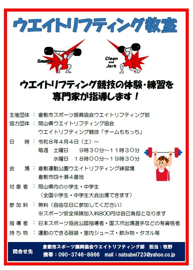 岡山県内の小学生、中学生を対象にジュニアウエイトリフティング教室を行います。