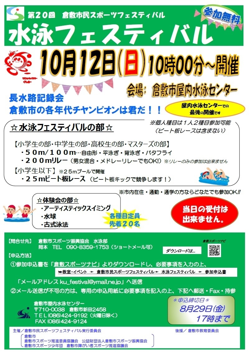 【問い合わせ先】 倉敷市スポーツ振興協会水泳部 事務局 岡本 TEL:090-8359-1753