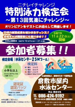 対象 | 岡山県在住の小学生以上 ※小学生未満は要相談 (25M以上泳げない方はご遠慮下さい) |