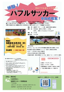 はがきか市内運動公園窓口等に設置してある申込用紙に必要事項【①体験!バブルサッカー ②氏名(フリガナ) ③住所 ④昼間連絡先 ⑤学校名・新学年 ⑥身長 ⑦同意する(個人情報の取扱いについて)】を記入し、郵送又は持参。