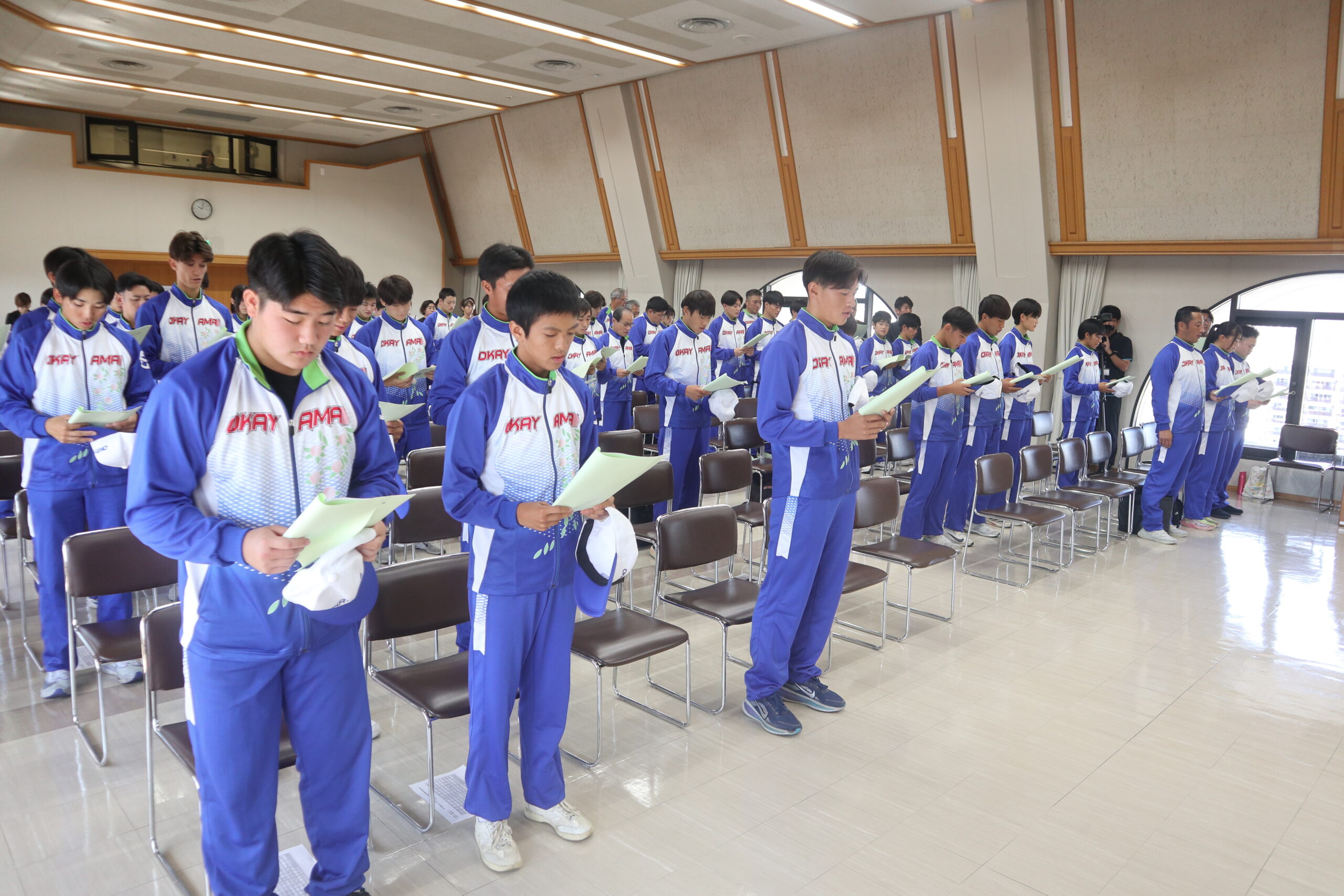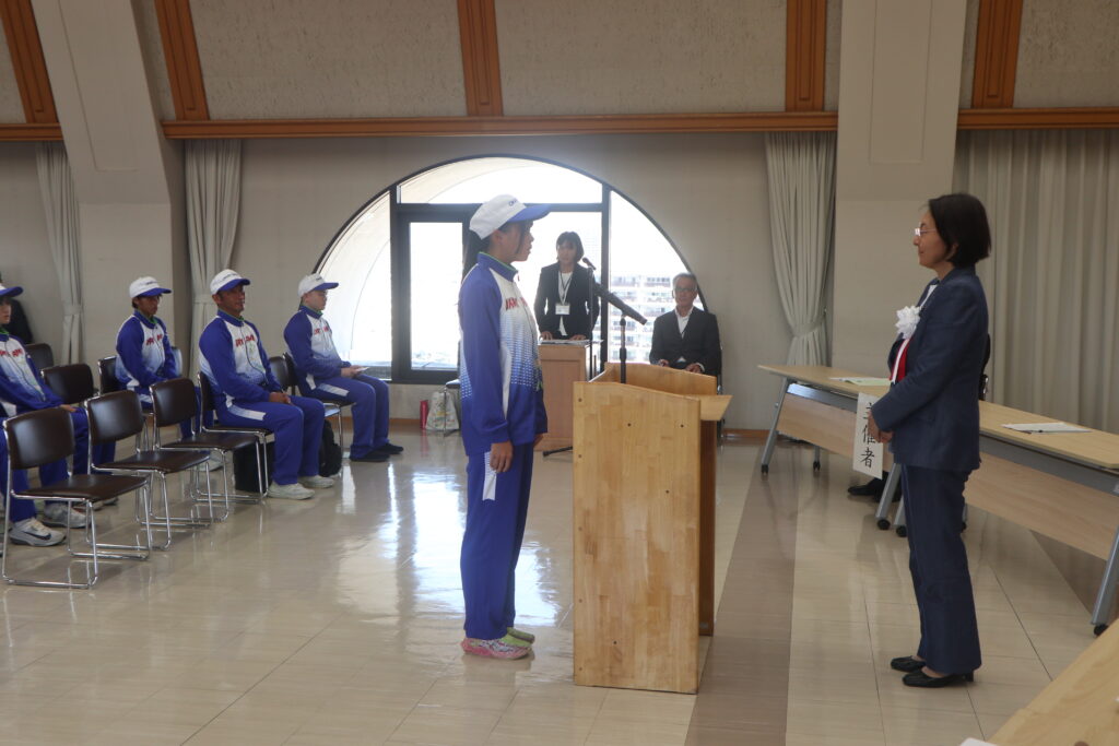 これらの激励に選手団からの謝辞を、陸上競技〔成年女子〕の秋岡里緒選手が行い、壮行式の最後には、会場全員で「がんばろう三唱」をハンドボール競技〔少年男子〕の所努監督の指揮のもと行い、選手団を鼓舞しました。