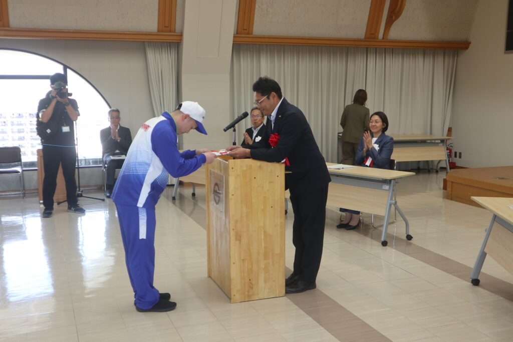 加えて、倉敷市スポーツ振興基金運営委員会の山口博隆副会長が選手団代表の木村和生選手(空手道競技〔成年男子〕)に奨励金を授与しました。