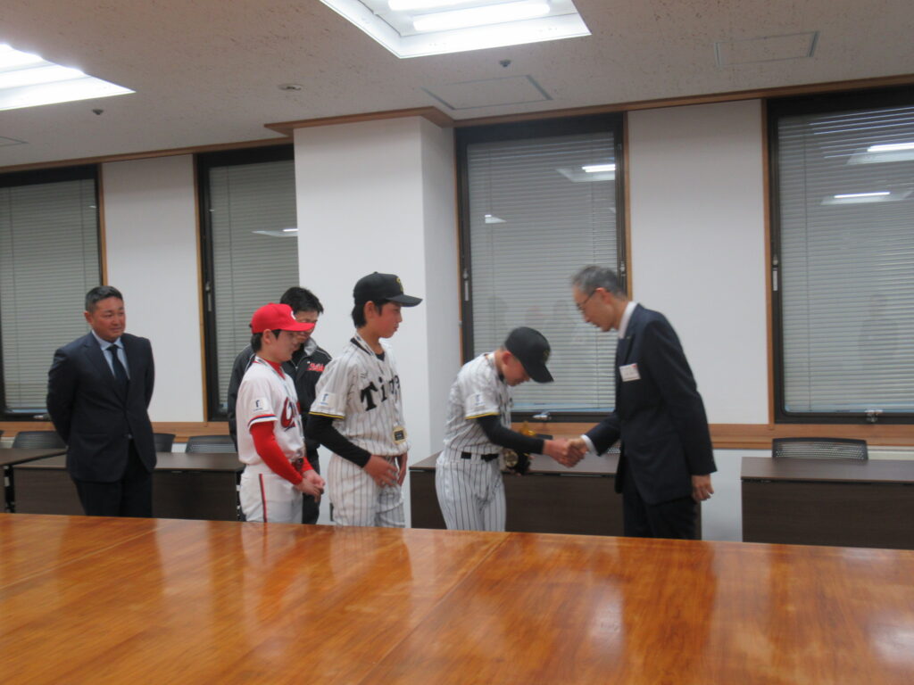 令和8年2月10日、倉敷市内の少年野球から「NPBジュニアトーナメントKONAMI CUP 2025」に選抜選手として出場し、その大会で優秀な成績を収めた報告に選手・関係者の皆さんが小松倉敷副市長を訪問されました。