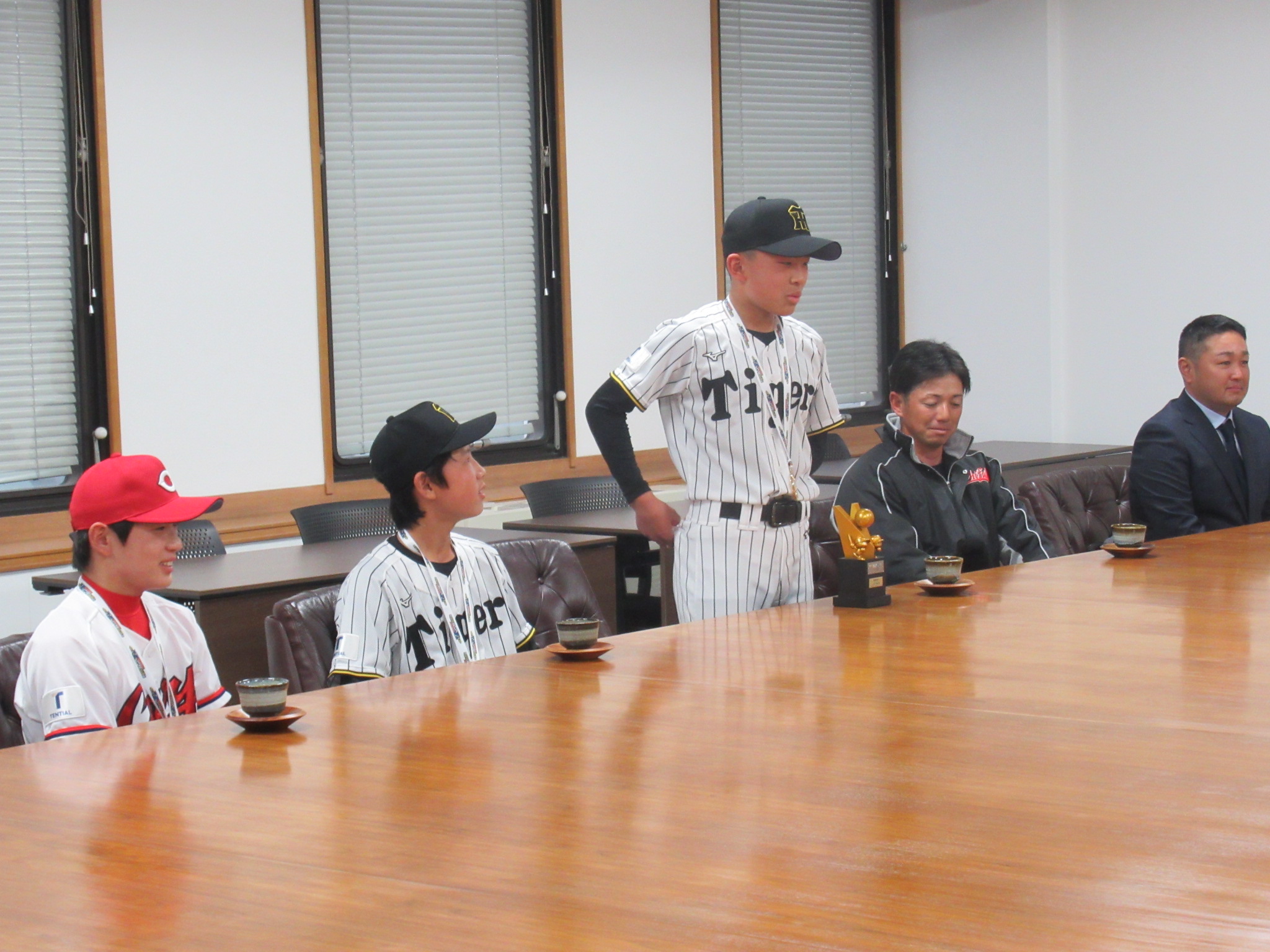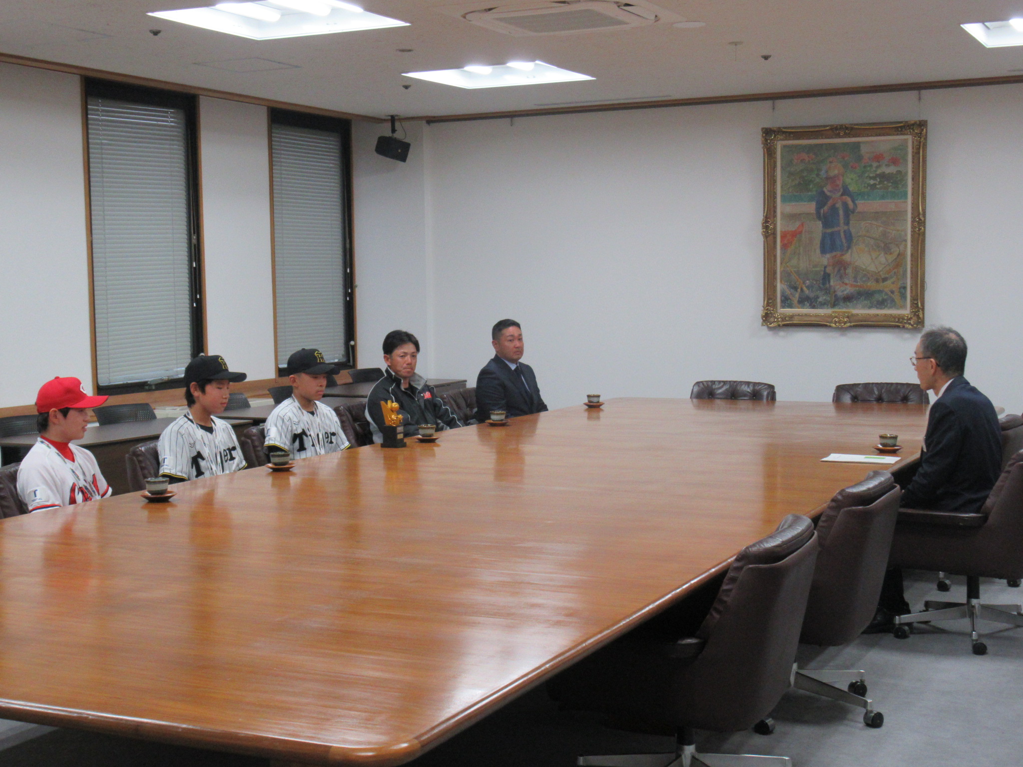 令和8年2月10日、倉敷市内の少年野球から「NPBジュニアトーナメントKONAMI CUP 2025」に選抜選手として出場し、その大会で優秀な成績を収めた報告に選手・関係者の皆さんが小松倉敷副市長を訪問されました。